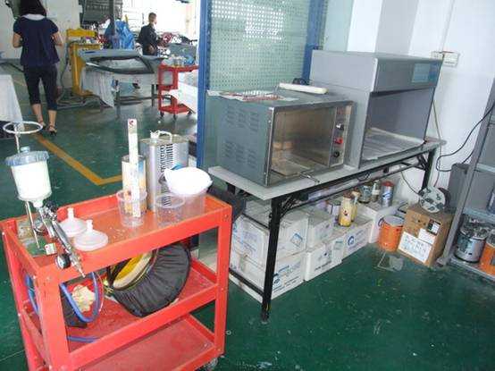 調漆所用到的工具、色卡紙、烤箱、與燈箱