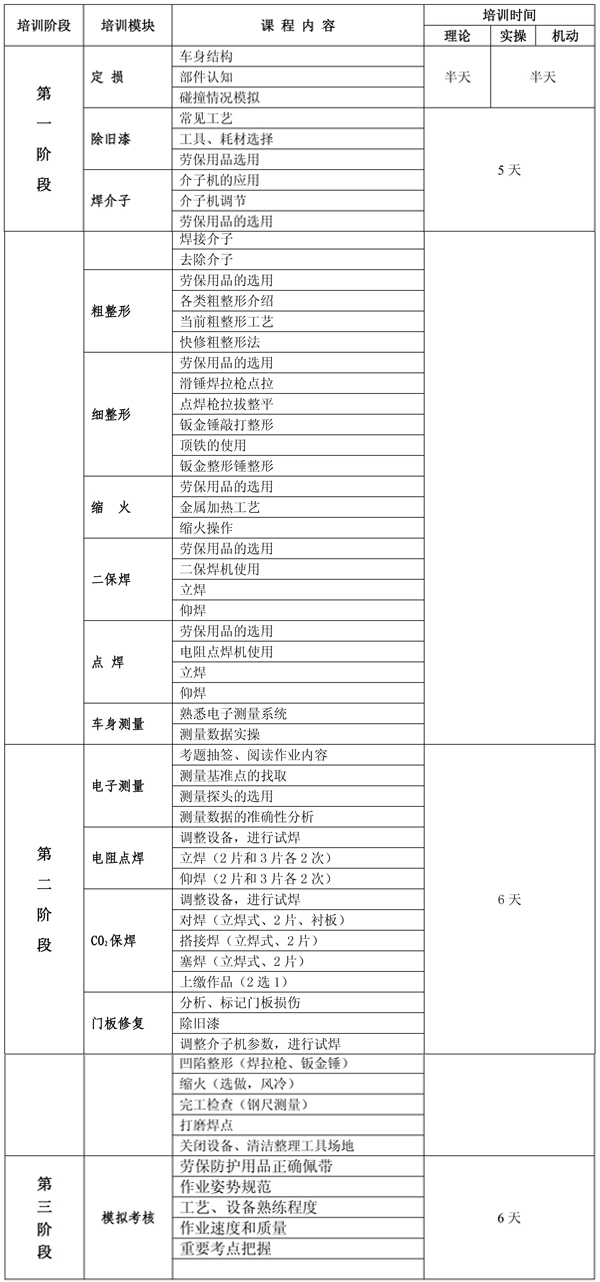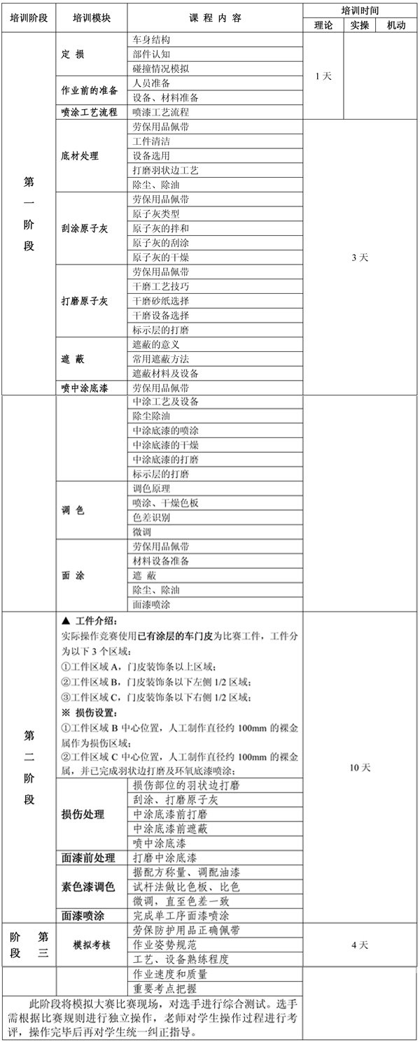 整個培訓課程分三個階段,其中第一階段先按車身修復的基本工藝驟步培訓,時間約為10天;第二階段則以競賽項目專項培訓,時間也為10天;第三階段主要以模擬大賽現(xiàn)場,進行綜合強化訓練。詳情見下表: