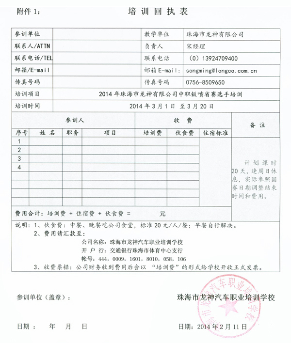 為了響應國家“企業(yè)應該積極融入和參與職業(yè)教育事業(yè)”的號召,讓部分參賽條件和設施不足的學校也能參加技能大賽,促進全國中職技能大賽在全國的快速和均衡地發(fā)展,珠海市龍神有限公司憑借自身20多年的汽車鈑噴行業(yè)經(jīng)驗和設備技術優(yōu)勢,定于2014年3月1日至3月20日在珠海舉辦為期20天的汽車車身修復與涂裝技能大賽選手培訓,具體方案如下: