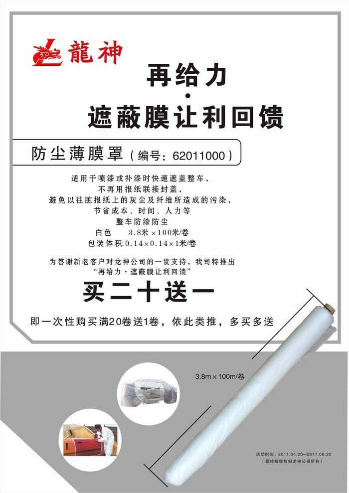 2011年4月再給力·遮蔽膜讓利回饋促銷! 2011年4月再給力·遮蔽膜讓利回饋促銷! (活動已結(jié)束,感謝您的關(guān)注) 一、活動主題: “再給力,遮蔽膜讓利回饋” 二、活動時間: 1、時間:2011年04月20日至2011年06月20日 2、時長:共計2個月 三、促銷產(chǎn)品: 防塵薄膜罩 尺寸3.8米*100米/卷 龍神編號:62011000 買20送1 ,一次性購買滿20卷送1卷,如此類推,多買多送。 2011-04-19 12256
