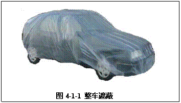 汽車修補(bǔ)噴涂時(shí),為了保護(hù)修補(bǔ)部位以外范圍不受漆霧、灰塵的污染,因此就要對(duì)非修補(bǔ)區(qū)域進(jìn)行覆蓋保護(hù),這就是所謂的遮蔽。遮蔽是非常重要的工作,所有部分修補(bǔ)涂裝(包括點(diǎn)修補(bǔ)、點(diǎn)擴(kuò)展修補(bǔ)和區(qū)域修補(bǔ))在噴漆前,都要對(duì)噴涂區(qū)域周圍的區(qū)域進(jìn)行遮蔽保護(hù),修補(bǔ)面積較大或點(diǎn)較多時(shí)還需進(jìn)行整車遮蔽(如圖4-1-1)。有時(shí)在清除修補(bǔ)區(qū)域舊涂膜的作業(yè)和研磨、拋光等作業(yè)時(shí)也需要對(duì)相關(guān)部分進(jìn)行遮蔽保護(hù)。