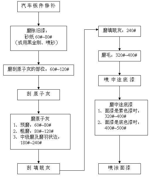 汽車修補干磨程序及砂紙的選擇 備注: 1、除舊漆時采用黑金剛配除漆除銹機能夠快速地除去平面、狹縫及凹凸不平表面的舊漆與銹漬;采用噴砂槍噴砂還可以很快地去除某些孔隙、縫隙或手都很難伸進去的部位的舊漆與銹斑; 2、在磨填眼灰、中途底漆和尤其有邊角位、弧度位的表面時配打磨緩沖墊(置于圓盤砂紙和托盤之間)能夠使打磨作業(yè)更加順暢,并能獲得規(guī)則的表面質(zhì)量。 2007-08-25 12244