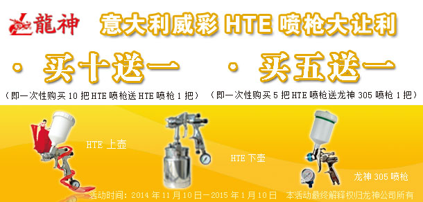 活動內(nèi)容: 1、買十送一(即一次購買十把HTE噴槍送一把HTE噴槍) 2、買五送一(即一次購買五把HTE噴槍送一把龍神305噴槍) 活動期間HTE上下壺噴槍的贈送方式為:以多贈送原則(如:買6把上壺+4把下壺,贈送上壺。反之亦然,以此類推。)