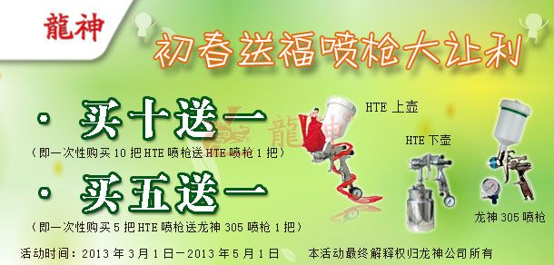 吉尼斯HTE噴槍“初春送福”促銷活動方案 (產(chǎn)品編號:30282000-30286000) 2013年3月份市場促銷方案如下:一、主題:“初春送?!眹姌尨笞尷?。二、活動時間:1、 時間:2013年03月1日至2013年05月1日 2、 時長:共計2個月 三、活動內(nèi)容:1、 買十送一(即一次購買十把HTE噴槍送一把HTE噴槍)2、 買五送一(即一次購買五把HTE噴槍送一把龍神305噴槍)四、具體操作方案 1、購買十把HTE噴槍送一把HTE噴槍 2、買五把HTE噴槍送一把龍神305噴槍 (以上二個方案具體促銷方式可按增量的形成搭配)
